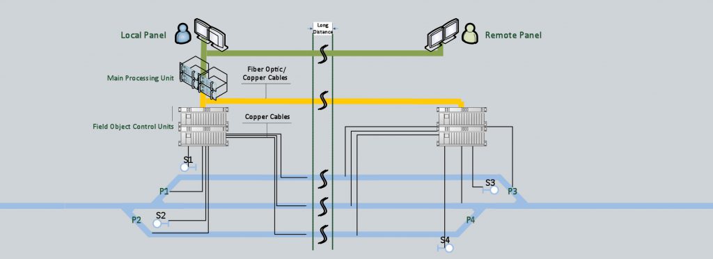 در ایستگاههای بزرگ جهت ممانعت از مصرف بیش از حد کابل ها چه در داخل ایستگاهها و چه در محوطه و کنار خطوط به ویژه در سیستم های خطوط آهن درون شهری که تجهیزات در سطح وسیع نصب شده اند، واحد کنترل المان های محوطه در کنار گروہ تجهیزات محوطه نصب می گردند وسپس از طریق ارتباط کابل فیبر نوری به واحد پردازش اصلی متصل می گردند. تمامی تجهیزات کنار خط از قبیل سوزنها، چراغ ها، مدارهای راه، محور شمارها و واسطه های بلاک به واحد کنترل المان های محوطه متصل می باشند.